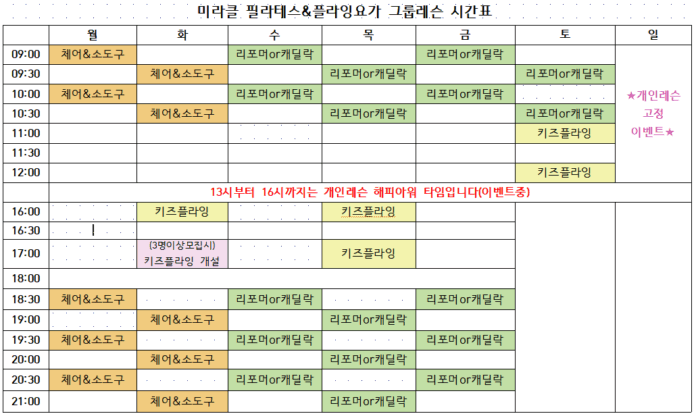 센터소식 미라클필라테스 11월 번째 주 시간표입니다 By 배수형 기자 - 2025년 11월 12일 0 3 Facebook Twitter Pinterest WhatsApp 11월 네번 째 주(11/17~11/22) 시간표 입니다 궁금하신 점이나 상담을 원하시는 분들은 네이버 예약에서 “미라클 필라테스”검색 후 방문 상담해주시거나 또는 톡으로 문의주시기 바랍니다 모든 수업은 예약 인원(2명 이하) 미달시 폐강 되거나 수업 시간이 변경될 수 있습니다. 폐강은 12시간 전에 됩니다.