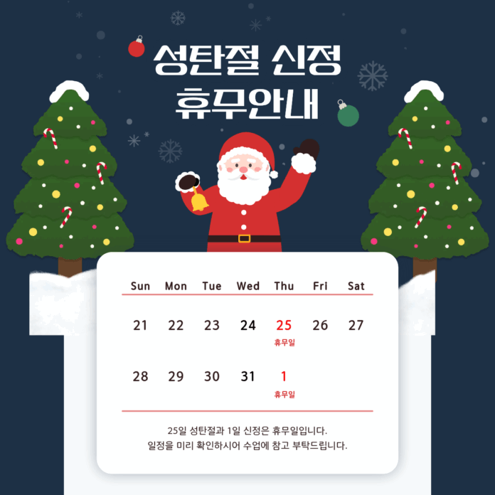 센터소식 미라클필라테스 12월,1월 휴무 안내입니다 By 배수형 기자 - 2025년 12월 4일 0 1 Facebook Twitter Pinterest WhatsApp 12월25일(목요일), 1월1일(목요일) 미라클필라테스는 휴관입니다. 휴무로 인한 수강권 기간은 휴무전날 자동연장됩니다 상담 및 수업일정에 참고부탁드립니다