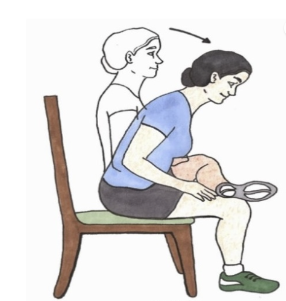 의자에 바르게 앉아 한쪽다리를 반대다리에 올려 올린다리를 잡고 상체를 천천히 숙여 줍니다. 엉덩이 쪽에 스트레칭 되는 당김이 느껴지실거에요.